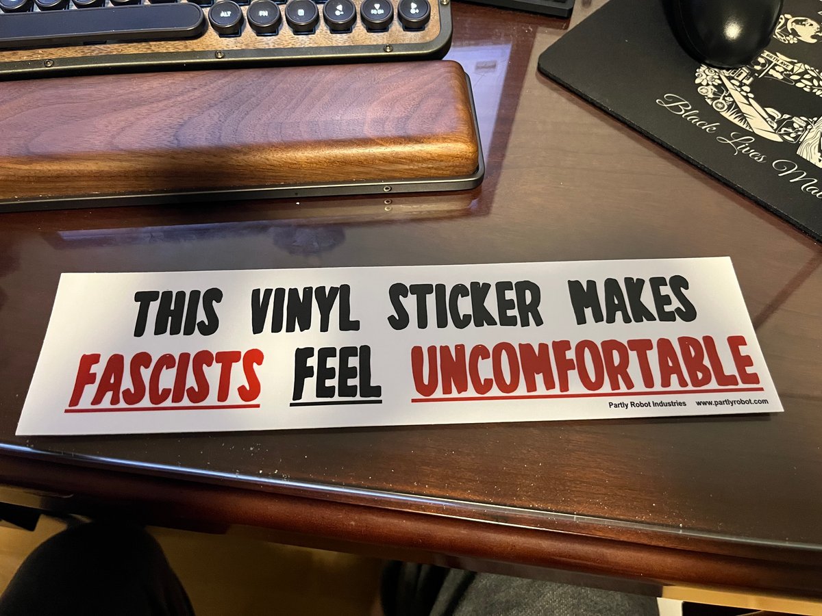 This is a 12" x 3.5" sticker that expresses my true feelings about political bumper stickers. At best, they're ignored. At worst, they inspire horrific road rage incidents. This sticker tries to find the sweet spot of plausible deniability for anyone who might get upset for being called out for fascistic behavior. Embrace your adversaries' discomfort! Buy this bumper sticker! Stick it to something!